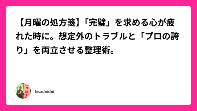 日記~とある一日のできごと~ 【手放す勇気】「自分にしかできないこと」に集中して、成果と心の余裕を両立させる技術 2026年1月22日 hisashiishii 昨日は長距離の旅路を終え、心身ともにリフレッシュした感覚がありました。しかし、日常に戻れば待っているのは、溢れんばかりのタスクと家族との賑 …
