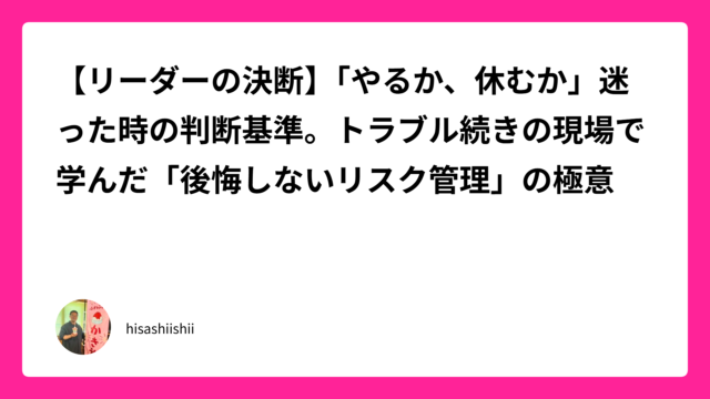 コラム 「勝手に決められた」とイライラした時に。リーダーが守るべき「責任の所在」と、心の平穏を保つ整理術。 2026年1月30日 hisashiishii 昨日は、事業を大きくしたいという野心と、早期リタイア(FIRE)して身軽になりたいという願いの間で揺れる、リーダーならではの葛藤についてお …