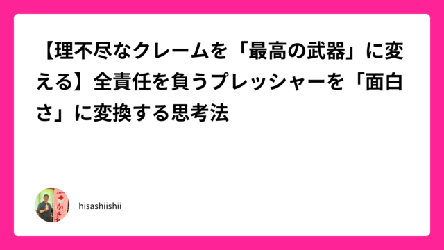 コラム 【理不尽なクレームを「最高の武器」に変える】全責任を負うプレッシャーを「面白さ」に変換する思考法 2026年2月17日 hisashiishii 昨日は、指揮者としての重圧を「家族との焼肉」で最高のエネルギーに変換し、10点満点の一日を締めくくるお話をお届けしました。心身ともにリフレ …