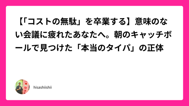 コラム 【「コストの無駄」を卒業する】意味のない会議に疲れたあなたへ。朝のキャッチボールで見つけた「本当のタイパ」の正体 2026年4月3日 hisashiishii 昨日は、バラバラになりそうな心をつなぎ止める「回転寿司の魔法」についてお話ししました。家族全員が「お寿司!」と即答できるような、小さくても …