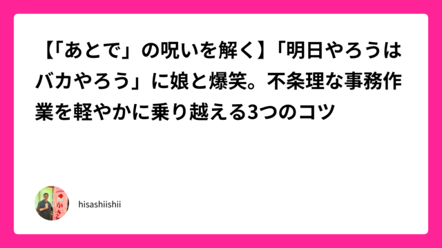 コラム 【「あとで」の呪いを解く】「明日やろうはバカやろう」に娘と爆笑。不条理な事務作業を軽やかに乗り越える3つのコツ 2026年4月15日 hisashiishii 昨日は、投資での大きな損失を「ちっちゃなこと」と笑い飛ばし、娘を学校へ送る15分の散歩を「死ぬ間際に持って行く宝物」として胸に刻むお話をお …