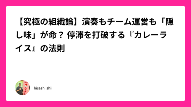 コラム 【究極の組織論】演奏もチーム運営も「隠し味」が命? 停滞を打破する『カレーライス』の法則 2026年4月21日 hisashiishii 昨日は、潮風に吹かれながら子供たちと貝殻を拾い、仲間たちと特大の串焼きを囲むという、五感が喜ぶ休日をお話ししました。理屈ではなく「ワクワク …
