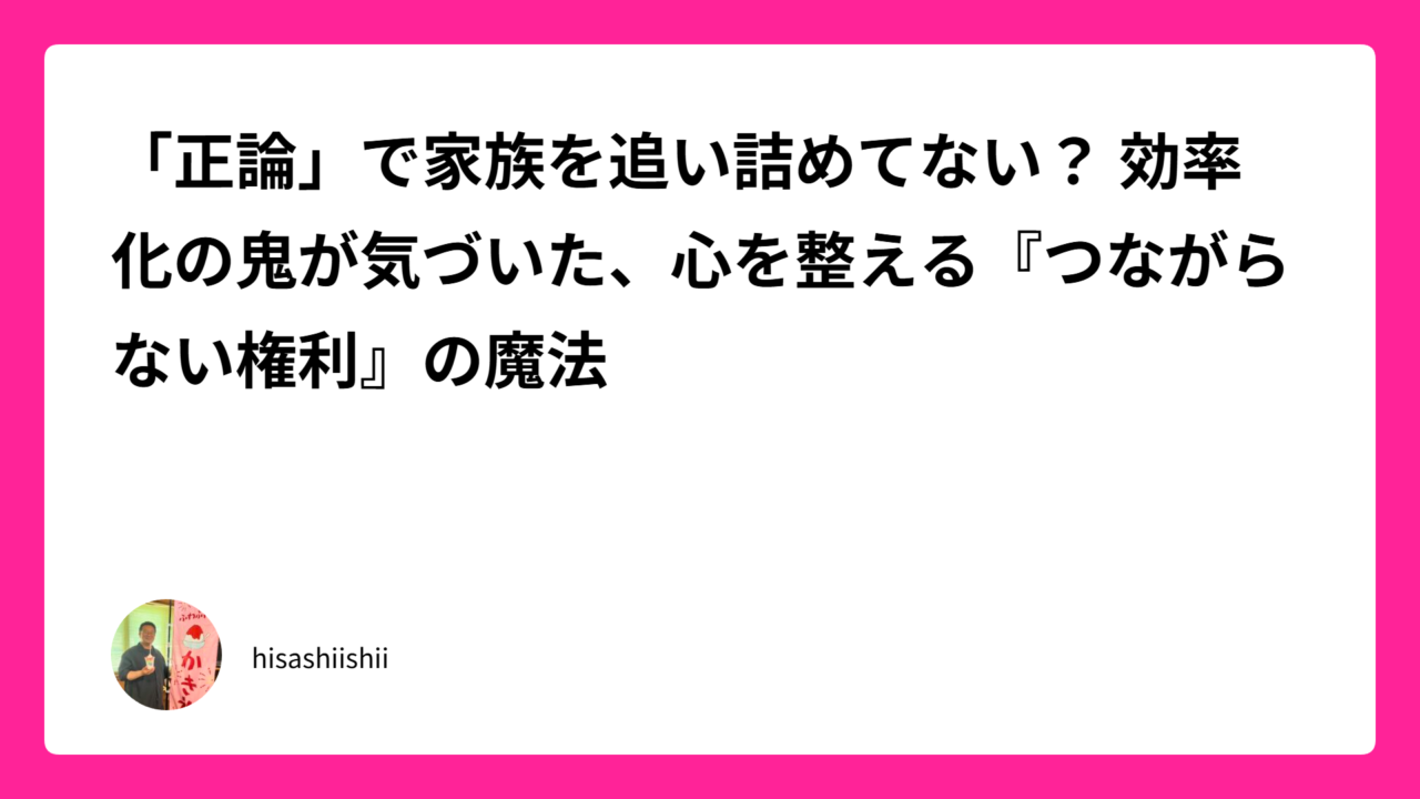 仕事では「最短距離」が正解ですが、家庭(特に育児や夫婦関係)では「寄り道」こそが豊かさの本質です。「効率的に夕食を済ませる」ことよりも、「パパといたい」と泣く子供を抱きしめる1分間の方が、長期的なリフレッシュ効果は高いもの。家の中では、あえて「非効率を楽しむ自分」という別キャラを演じるくらいがちょうどいいのです。