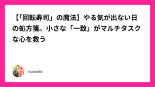 昨日は、バラバラになりそうな心をつなぎ止める「回転寿司の魔法」についてお話ししました。家族全員が「お寿司!」と即答できるような、小さくても純粋な「一致」を作ることが、マルチタスクな毎日を救う接着剤になる……そんな内容でしたね。